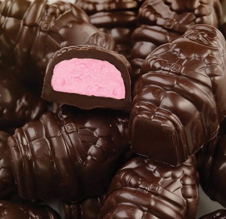 These are Dark Chocolate Santas with a Rasperry Cream in center - Dark Chocolate Raspberry Santa Toys from O'Shea's Candies is crafted in the spirit of true old?fashioned confectionery, bringing back the warm nostalgia of simpler times. Each piece is made with the same attention to detail and tradition that has defined O'Shea?s since 1934. Our family has spent generations perfecting recipes that honor the heritage of classic American candy shops, where handcrafted sweets were made with care, patience, and the finest ingredients. This item captures that timeless charm?inviting you to slow down, savor the moment, and enjoy a taste that feels familiar, comforting, and wonderfully indulgent. Whether you remember treats like this from childhood or are discovering them for the first time, you?ll appreciate the rich flavors, smooth textures, and unmistakable authenticity that make it uniquely O'Shea?s. Perfect for gifting, sharing, or keeping all to yourself, this nostalgic favorite carries the warmth of holidays, family gatherings, and old-time candy counters. Each bite reflects our legacy?carefully made in small batches, inspired by the same recipes our grandparents once used. We believe candy should do more than satisfy a sweet tooth; it should create memories, spark joy, and remind you of the traditions that have been passed down through generations. From the moment you unwrap it, you?ll experience the comforting aroma and irresistible flavor that represent nearly a century of craftsmanship. Each bite reflects our legacy?carefully made in small batches, inspired by the same recipes our grandparents once used. We believe candy should do more than satisfy a sweet tooth; it should create