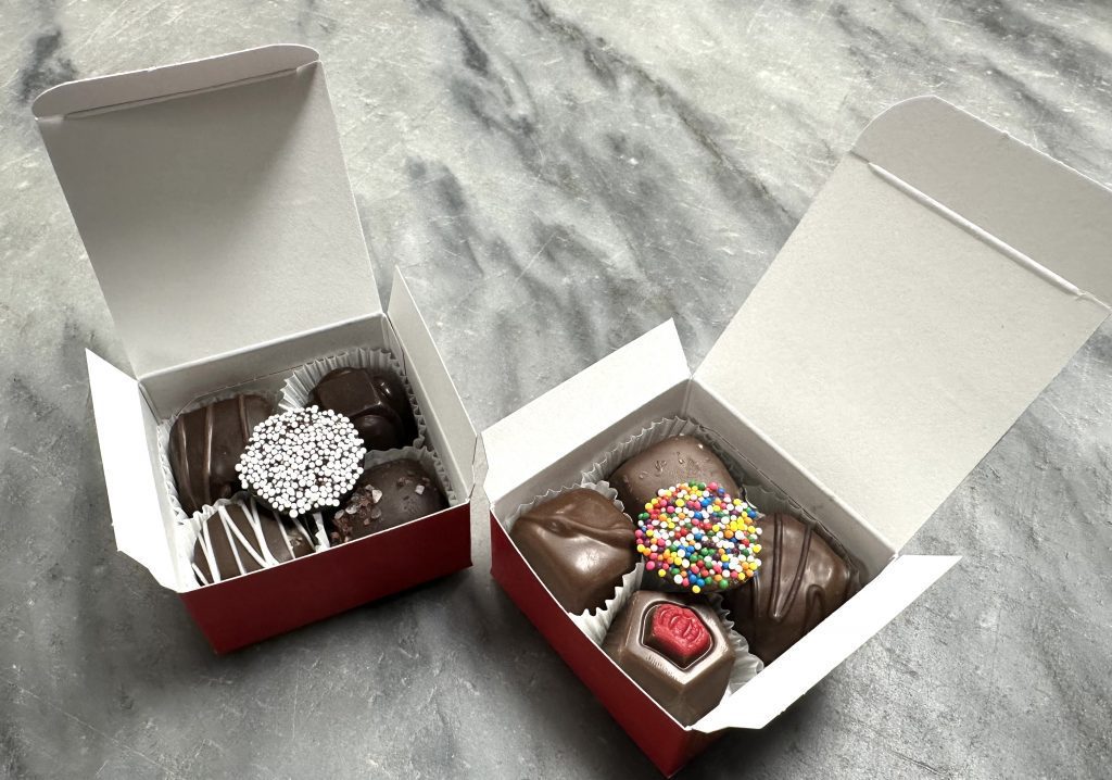 These made great corporate, wedding, shower, and event table gifts! O'Shea's 4 Piece Sampler Gift Box is a premium assortment that offers an unforgettable chocolate experience. It is a celebration of fine chocolate artistry. Each piece is carefully crafted with high-quality ingredients and contains a rich variety of flavors and textures. An elegant presentation makes it ideal for any occasion. Whether you're celebrating a special event or simply treating yourself, O'Shea's 4 Piece Sampler Gift Box delivers joy in every bite with its handcrafted flavor combinations.