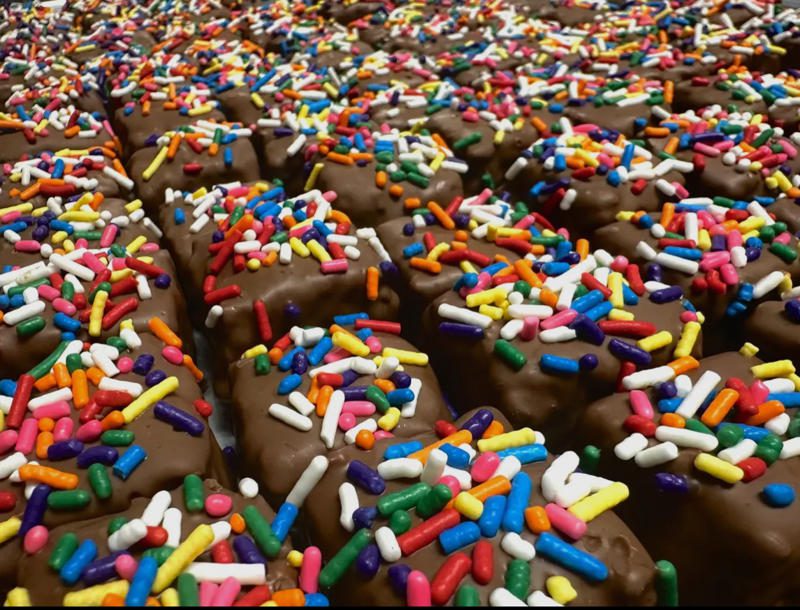 Classic crispy rice treats are dipped in smooth chocolate for added indulgence. Familiar, comforting, and handmade, they recall bake sales and homemade treats wrapped in wax paper.