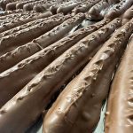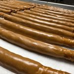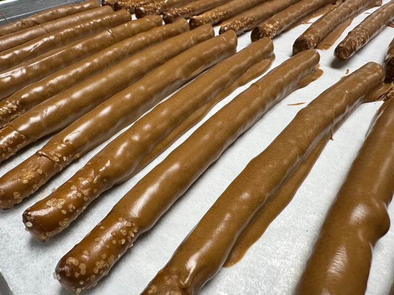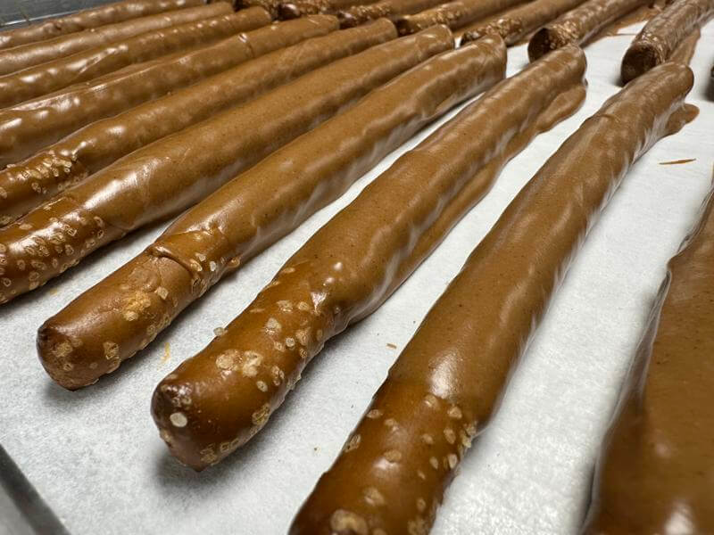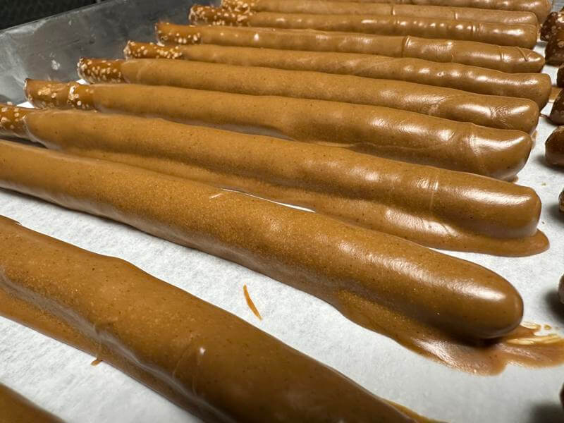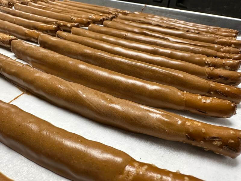 Pretzel rods are triple dipped in peanut butter and chocolate for rich indulgence. Sweet, salty, and satisfying, they reflect generous candy-making traditions of the past.